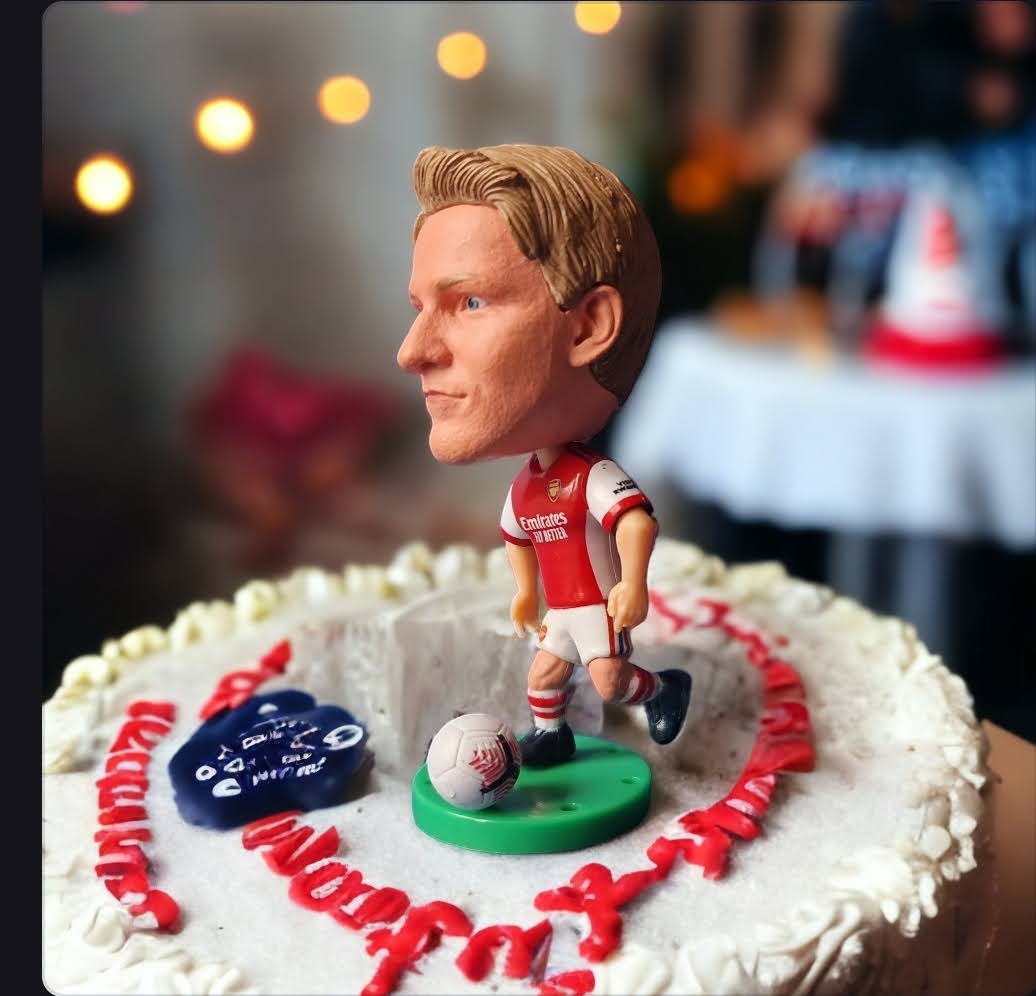 Made with attention to detail, this cake topper showcases Odegaard wearing the iconic Gooners shirt, complete with his captains number.